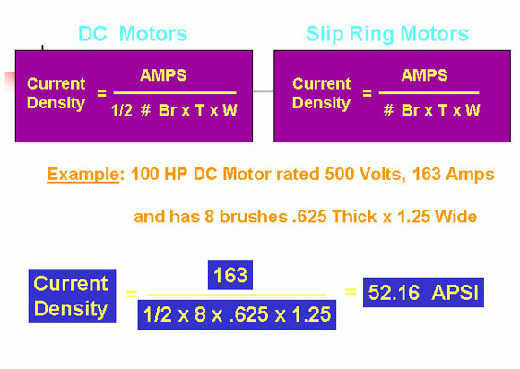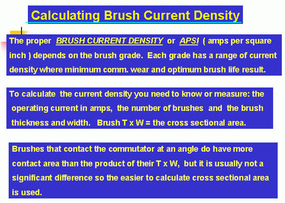 A majority of the operating time of a brush must be within the designed current density range. If the current density exceeds this for long periods, the commutator will run hot, blacken and brush life will be reduced. If the current density is too low, the film will be striped from the commutator and the commutator will begin to thread. If allowed to continue, sparking and threading will increase, brushes will wear rapidly and the commutator will require resurfacing.